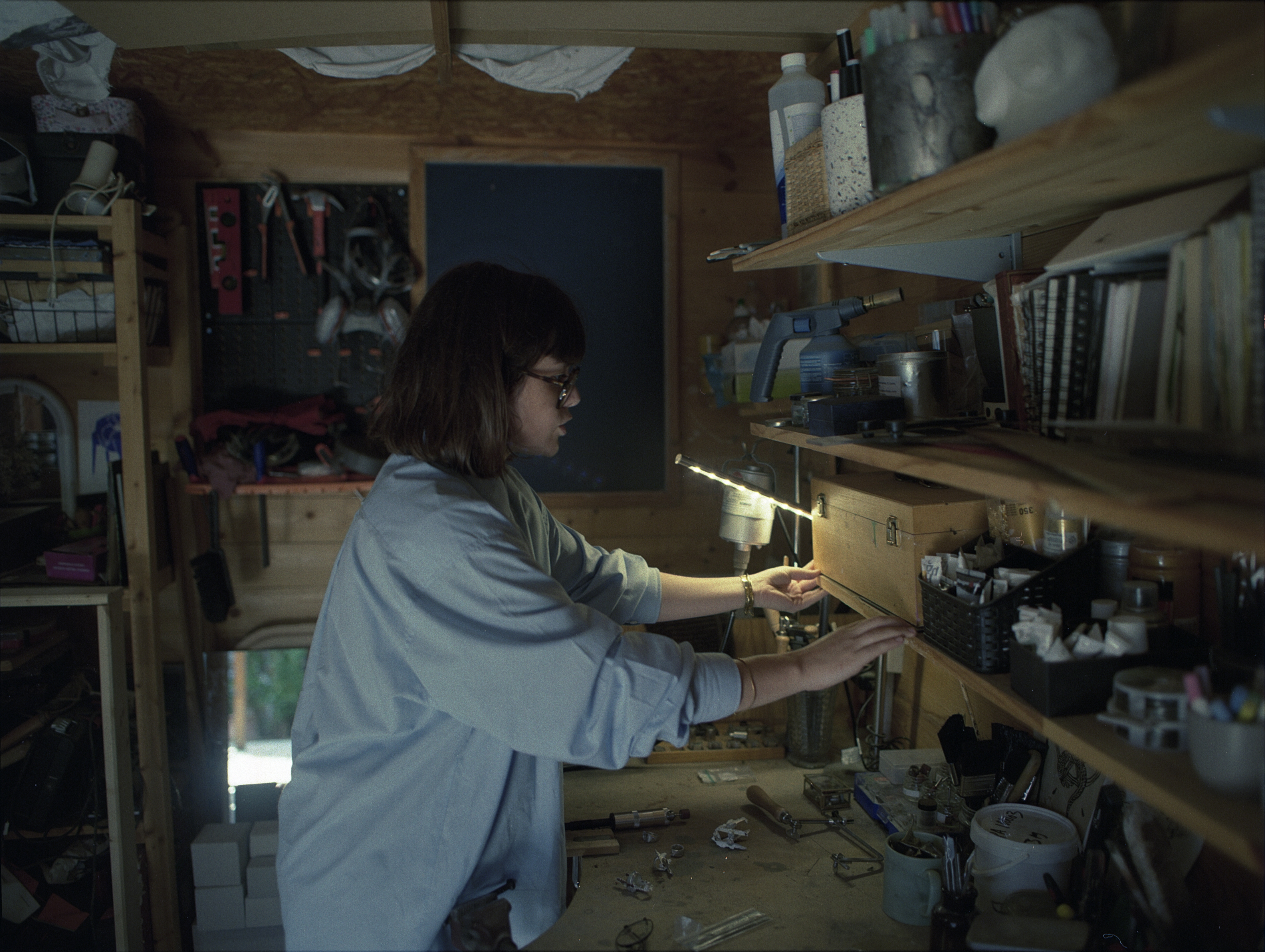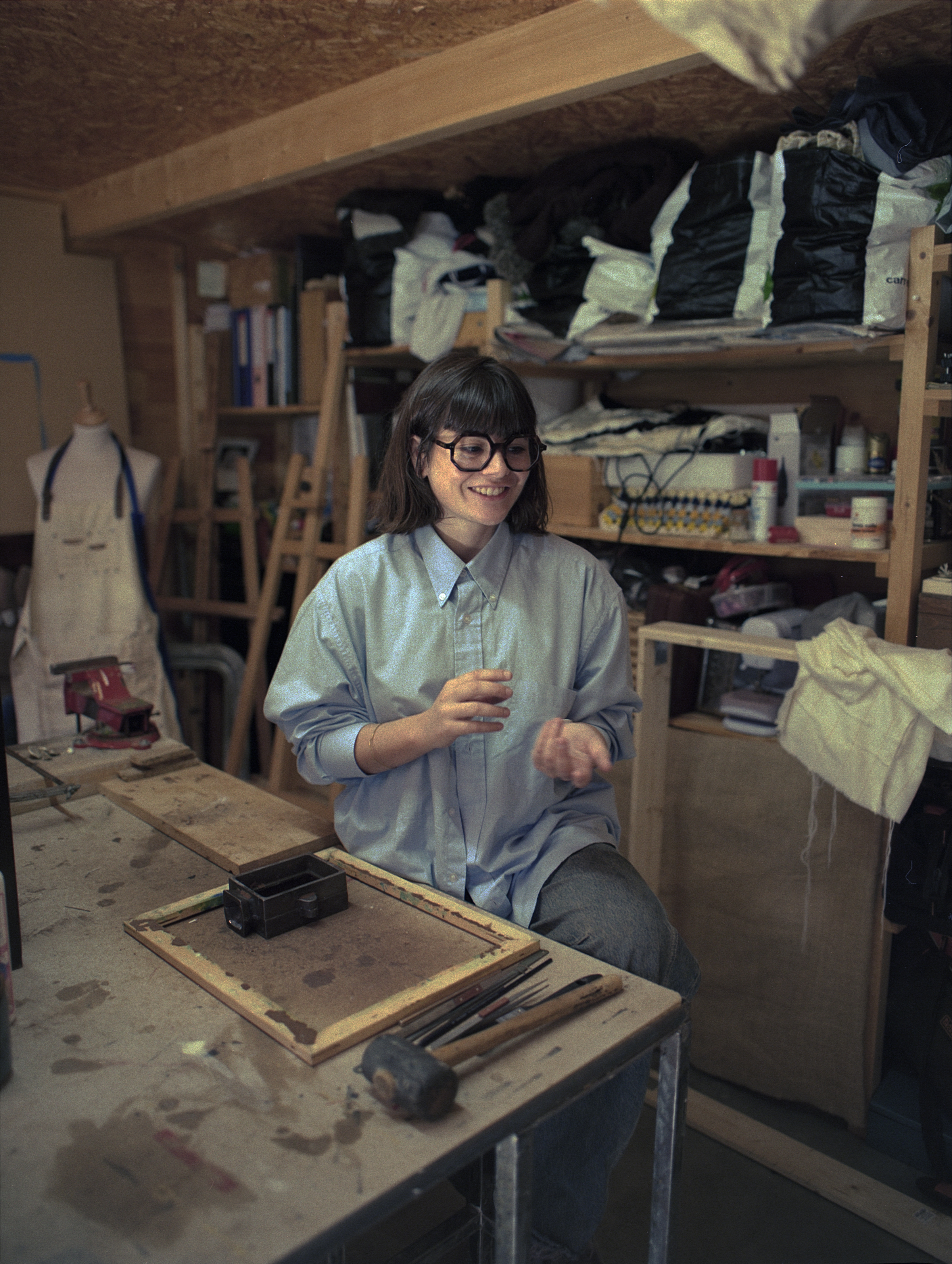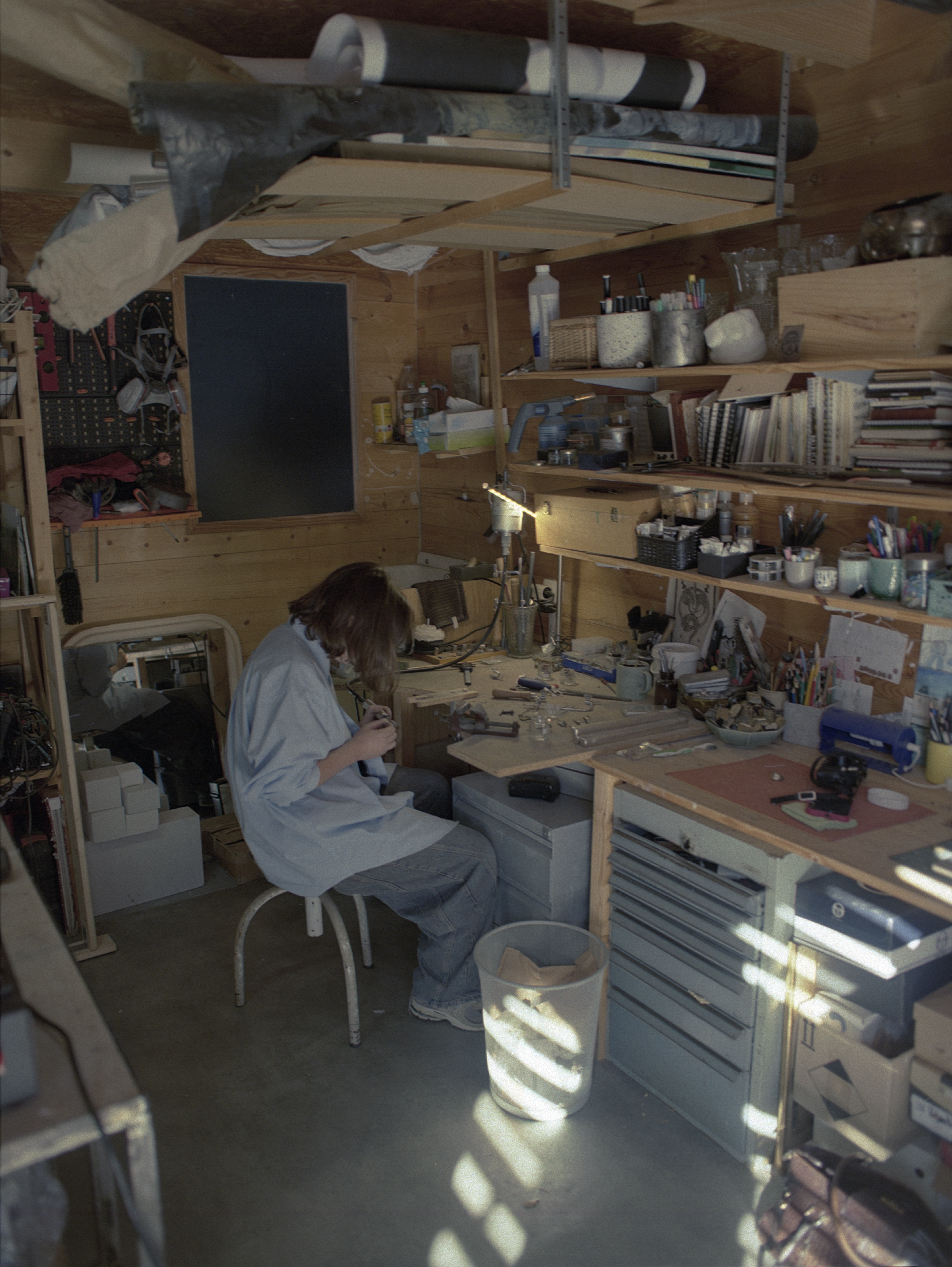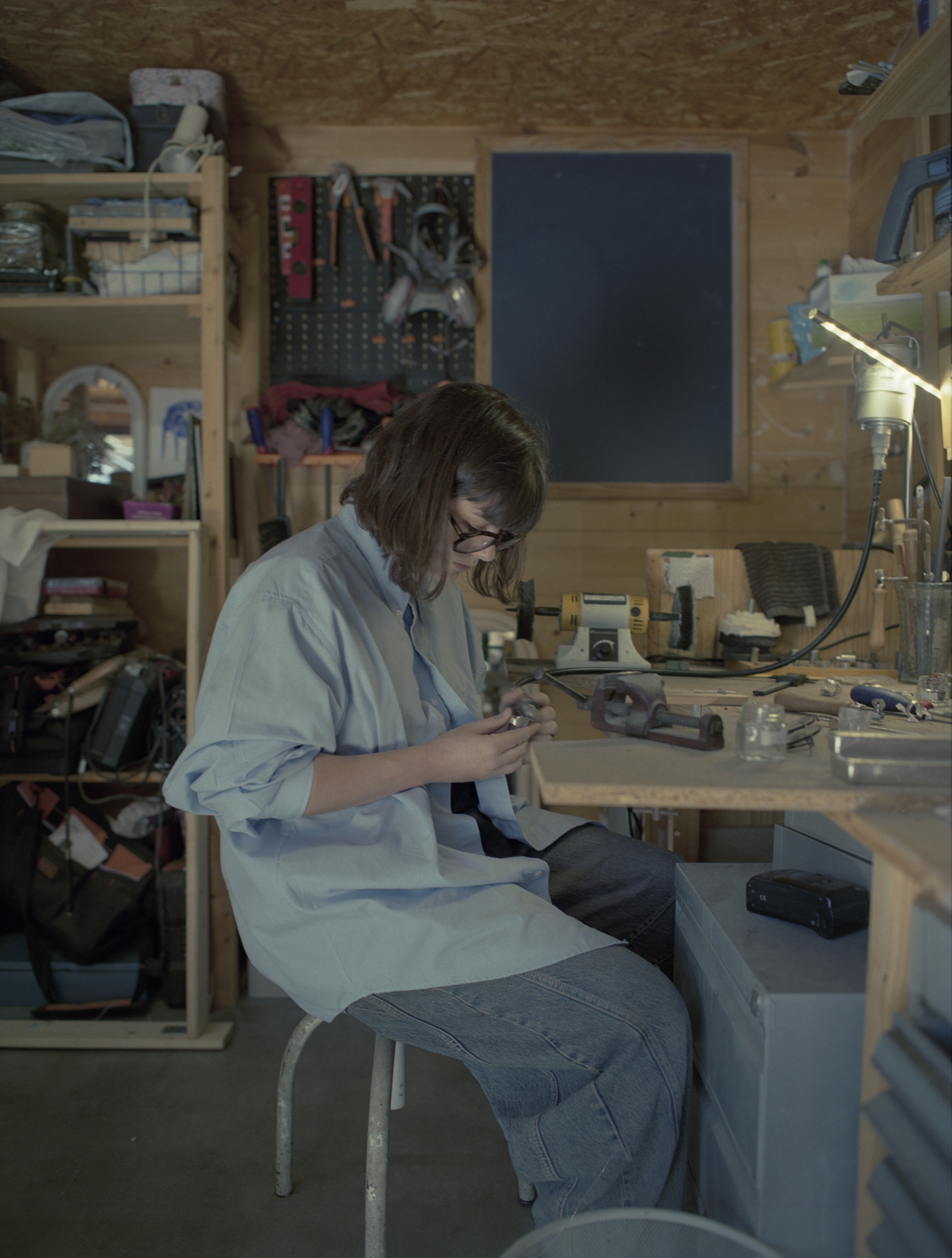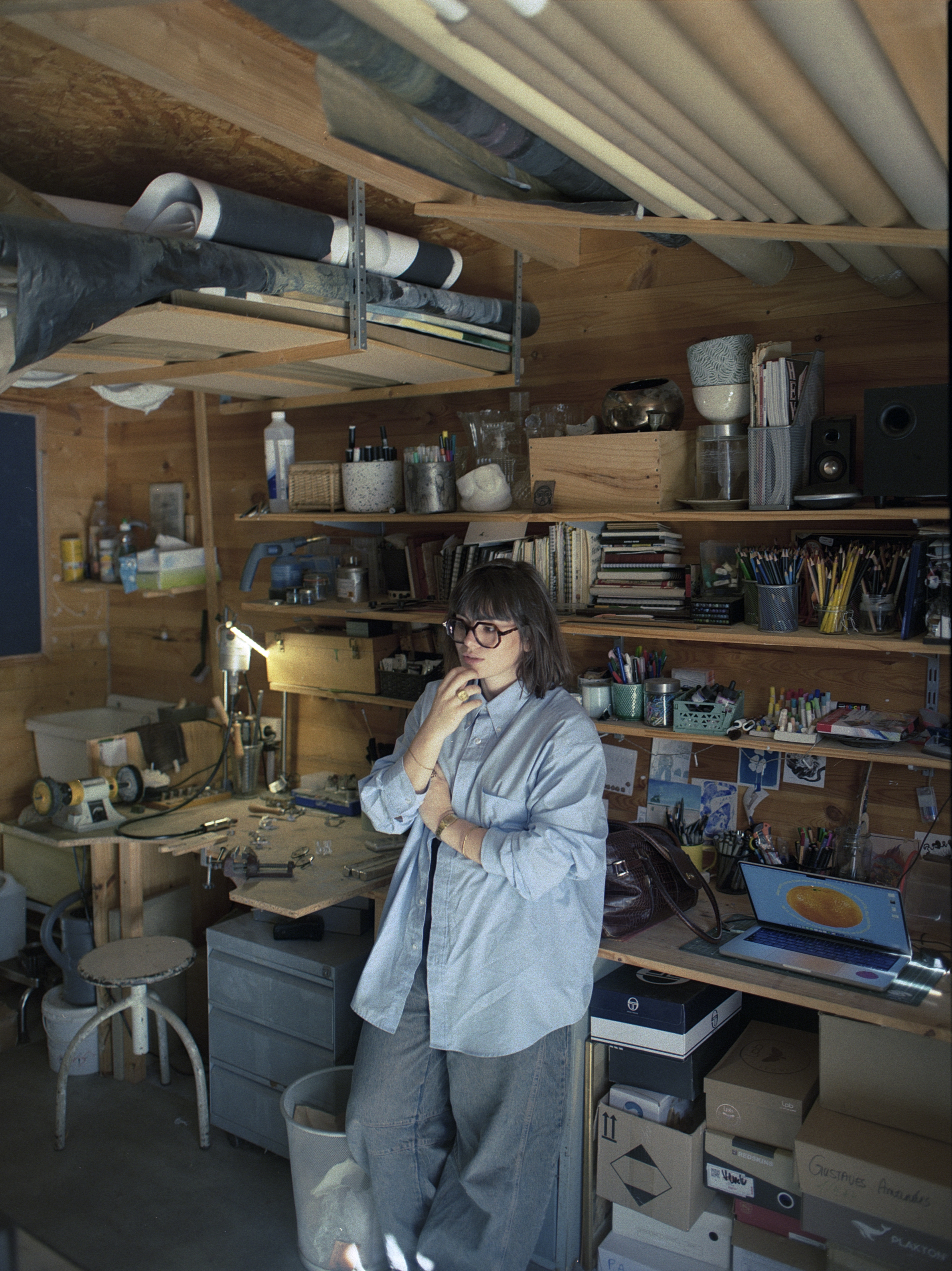 A few months later, I meet Justine Salvado, founder of the jewelry brand archive.s, in her studio near Narbonne. It is a small, bright space, large enough to accommodate her artistic practice and jewelry creation, as well as her sister, who is a painter. It is a shed filled with the tools they need, but also a place to experiment with various techniques.