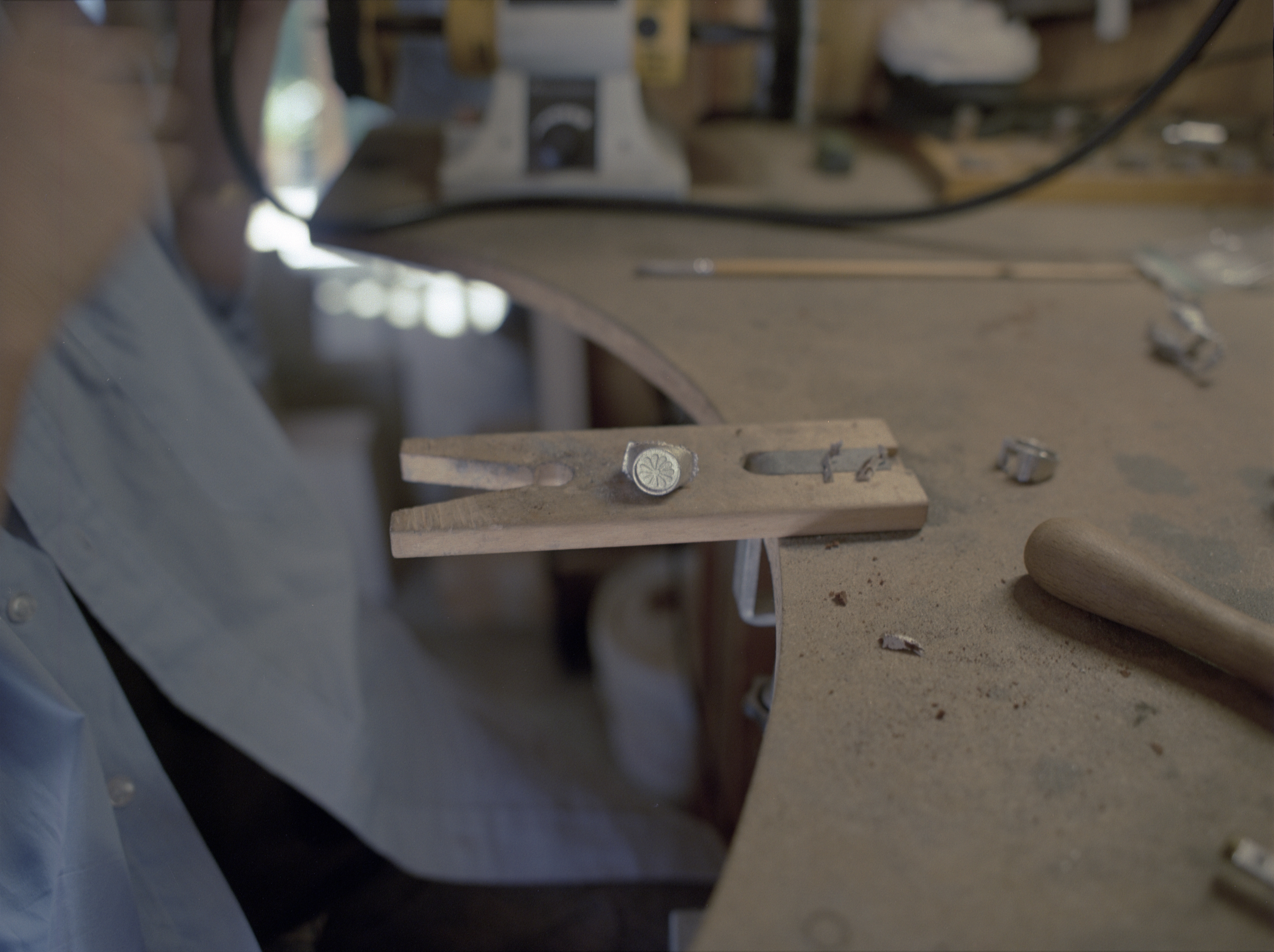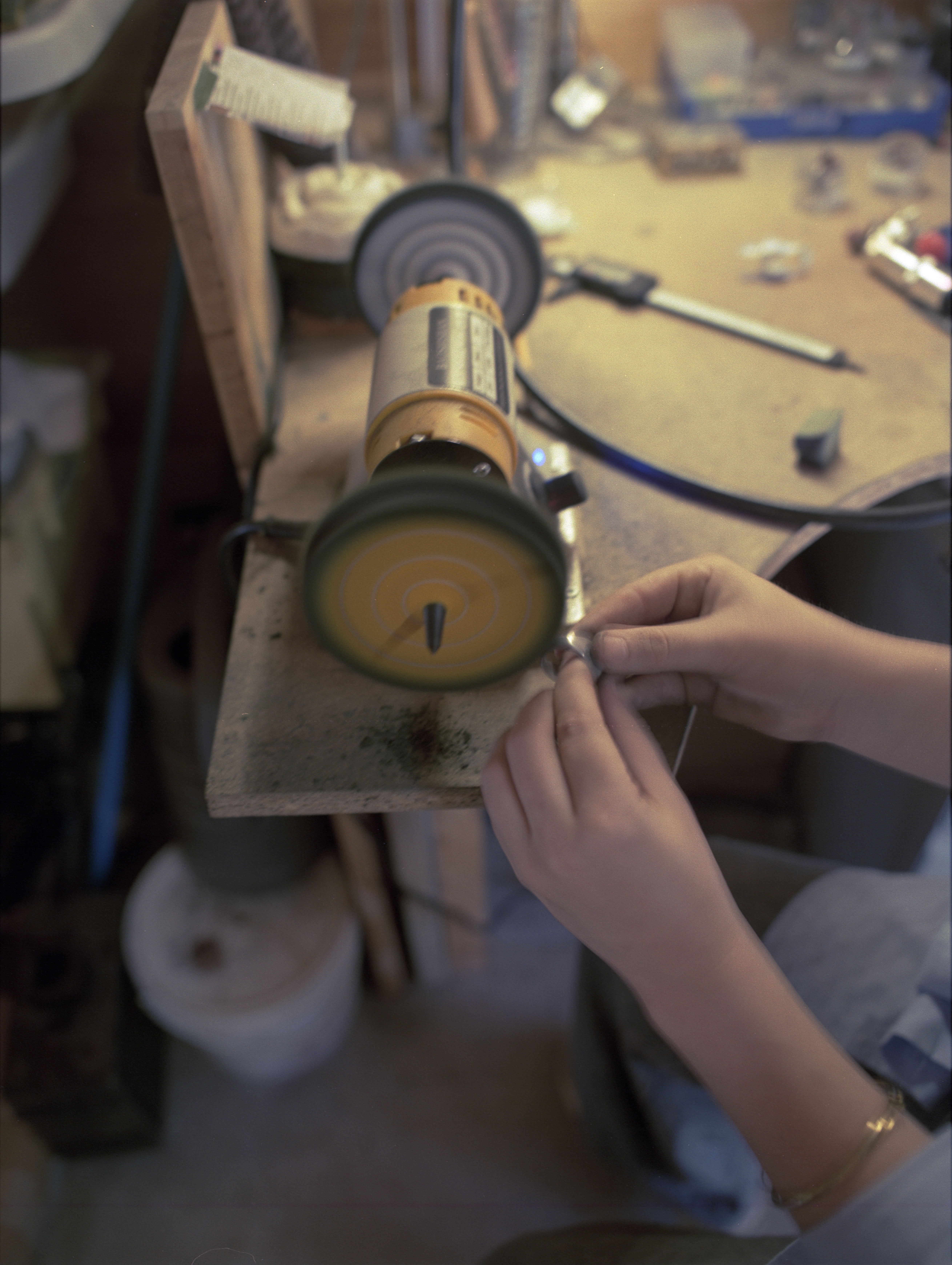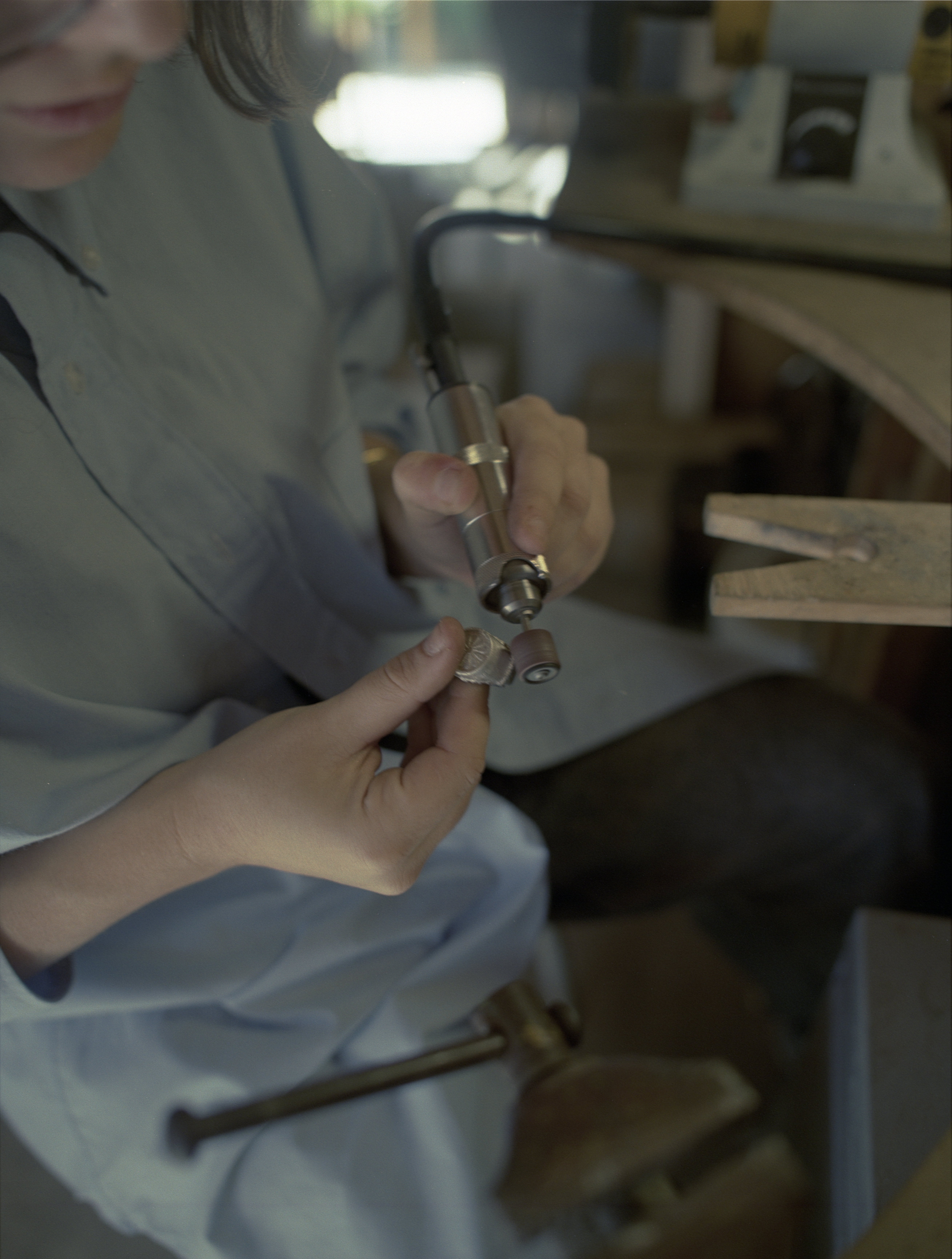 Une fois la pièce coulée et démoulée de la terre, le surplus est retiré et recyclé puis commence le façonnage. Cette étape est plutôt longue, mais de mon point de vue elle semble presque méditative. L’ajustement à la taille souhaitée arrive ensuite et elle applique un revetement sur la bague pour finalement la polir.