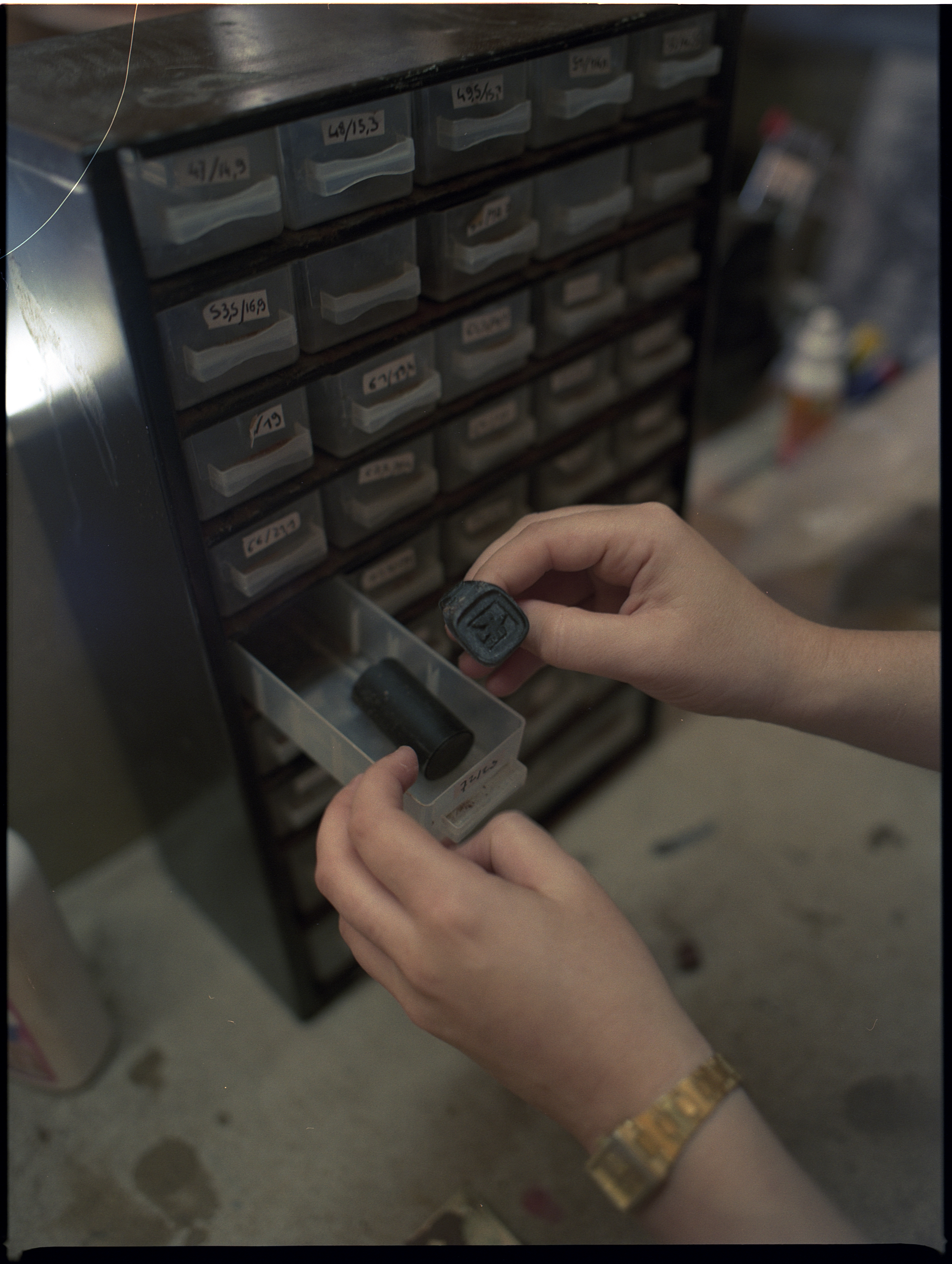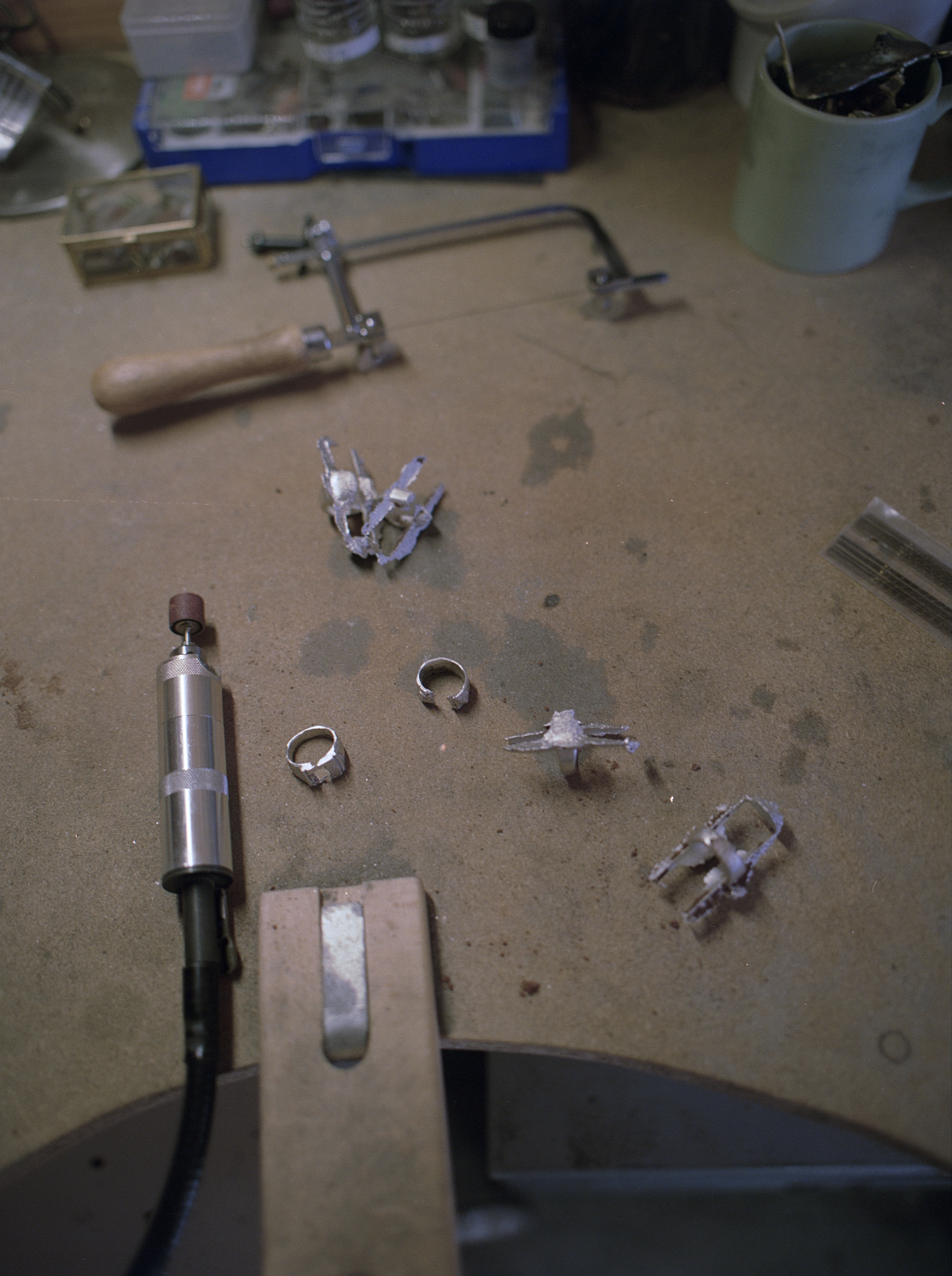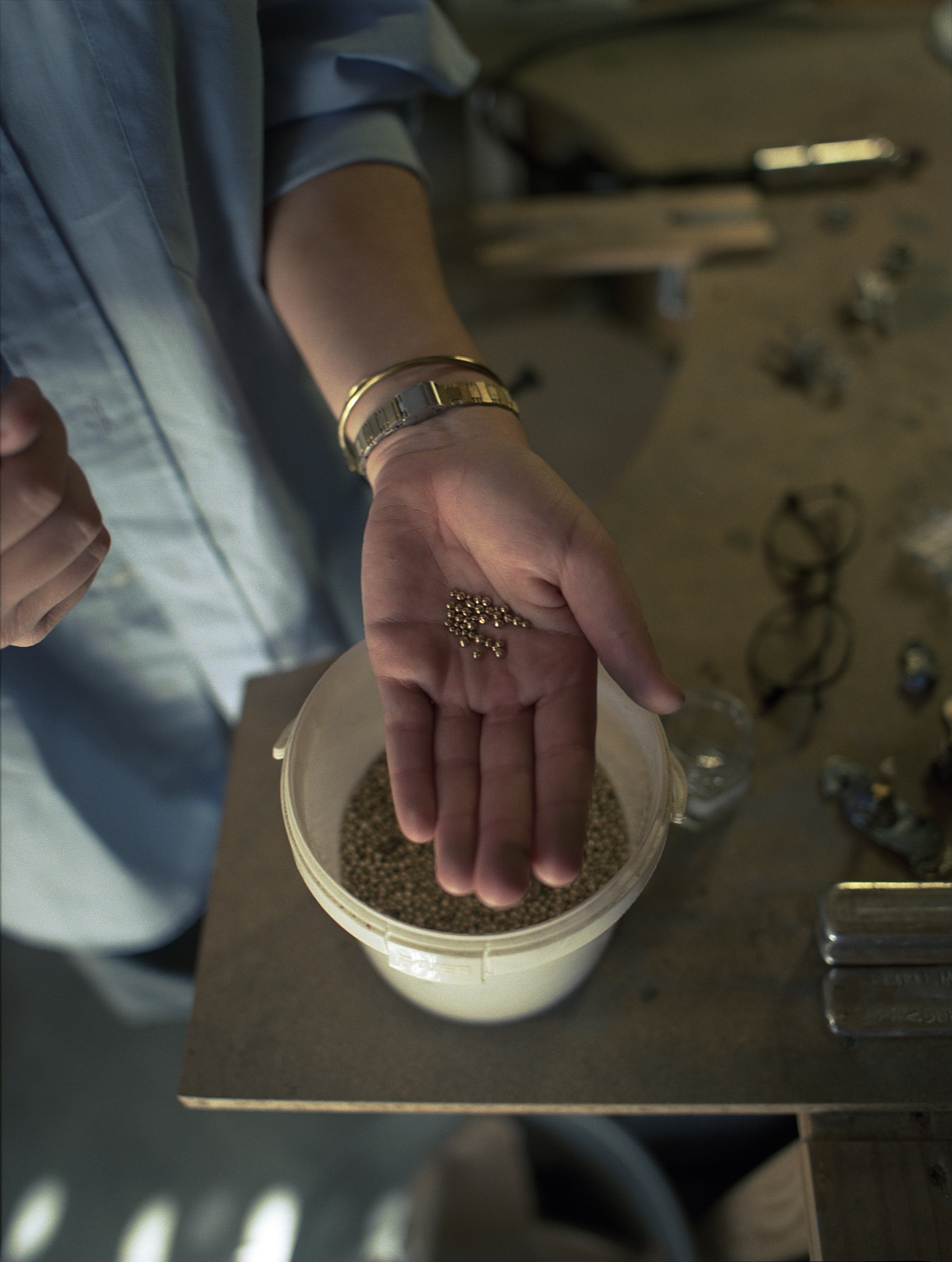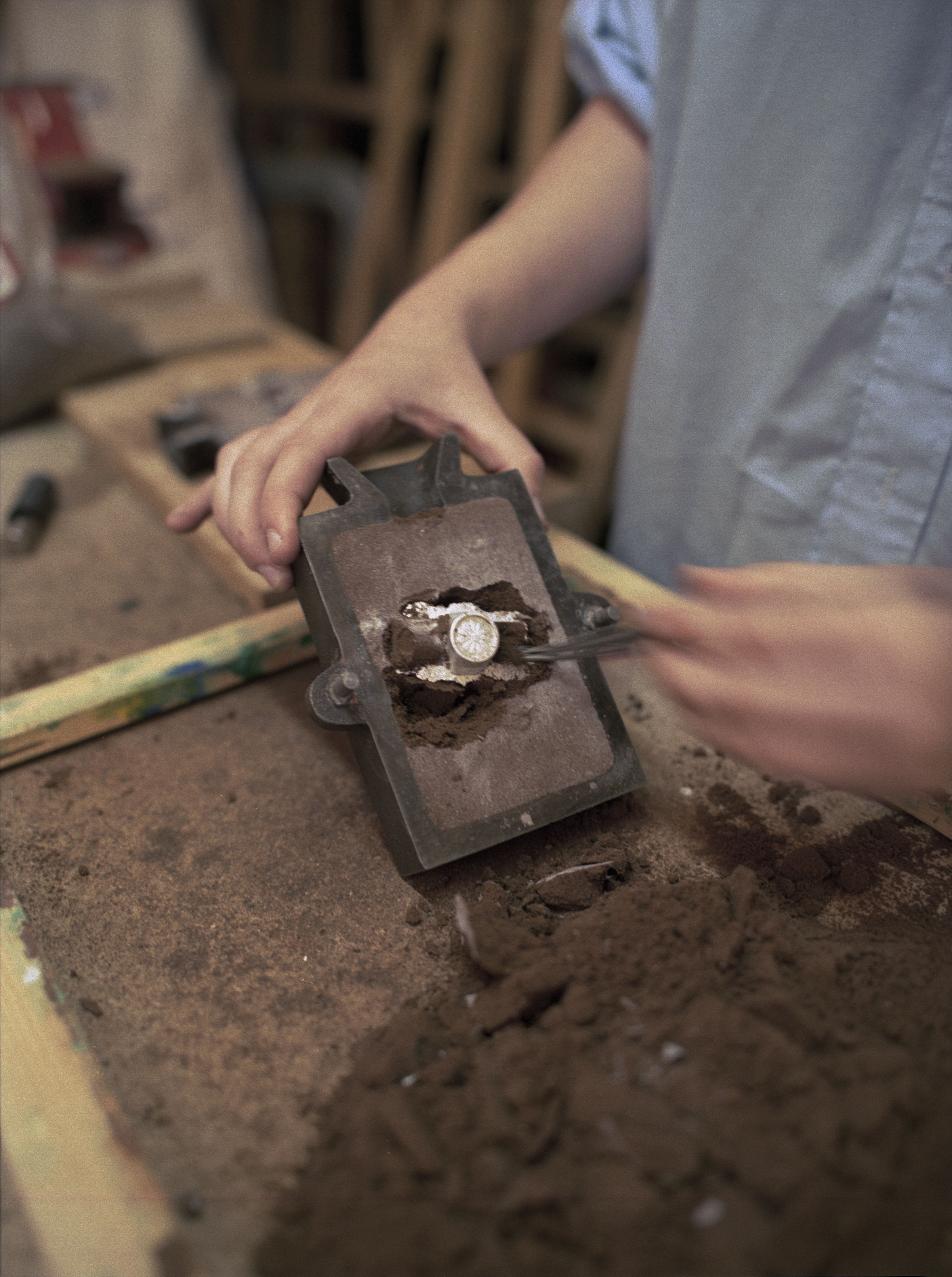 Une fois la pièce coulée et démoulée de la terre, le surplus est retiré et recyclé puis commence le façonnage. Cette étape est plutôt longue, mais de mon point de vue elle semble presque méditative. L’ajustement à la taille souhaitée arrive ensuite et elle applique un revetement sur la bague pour finalement la polir.