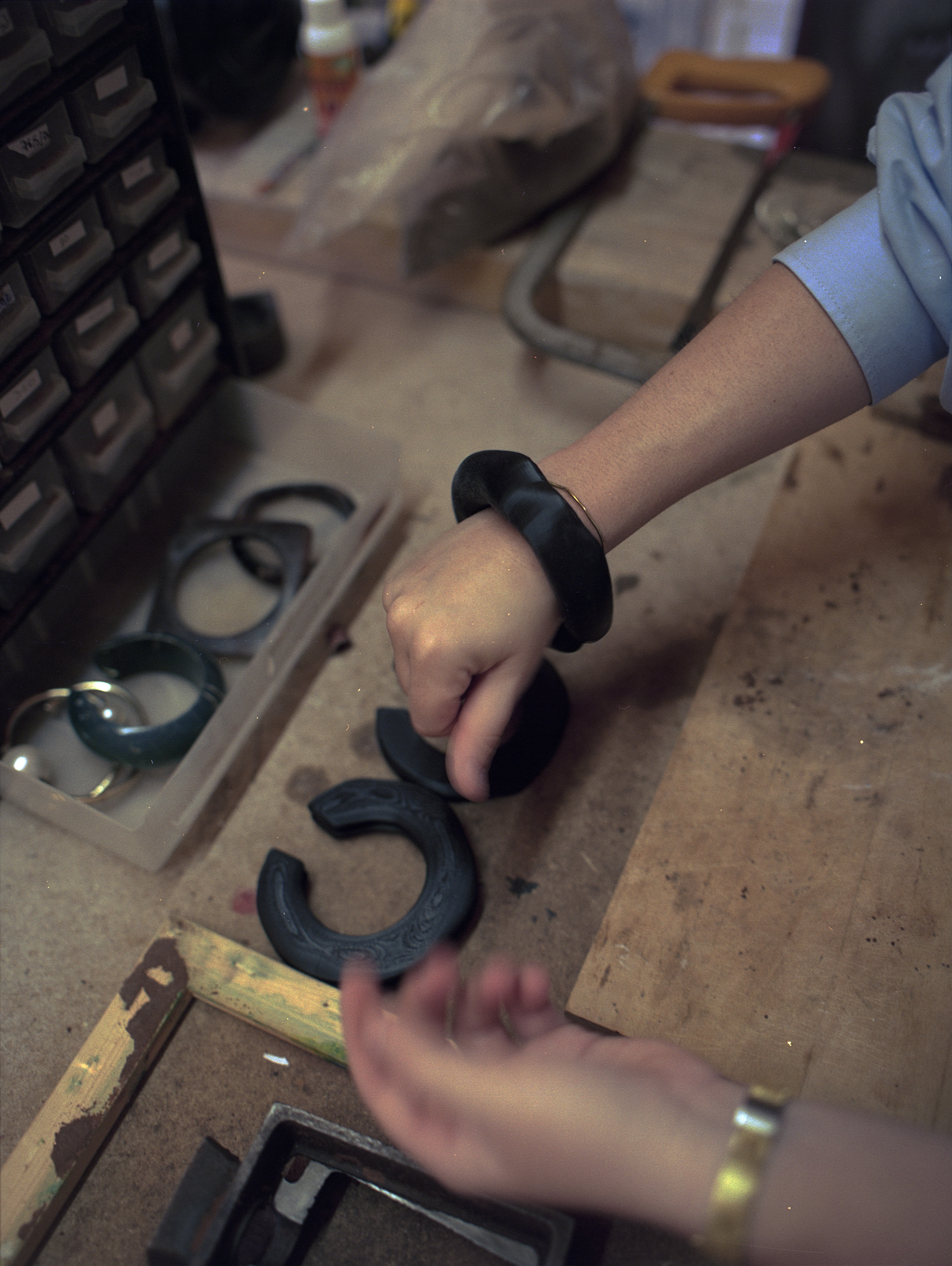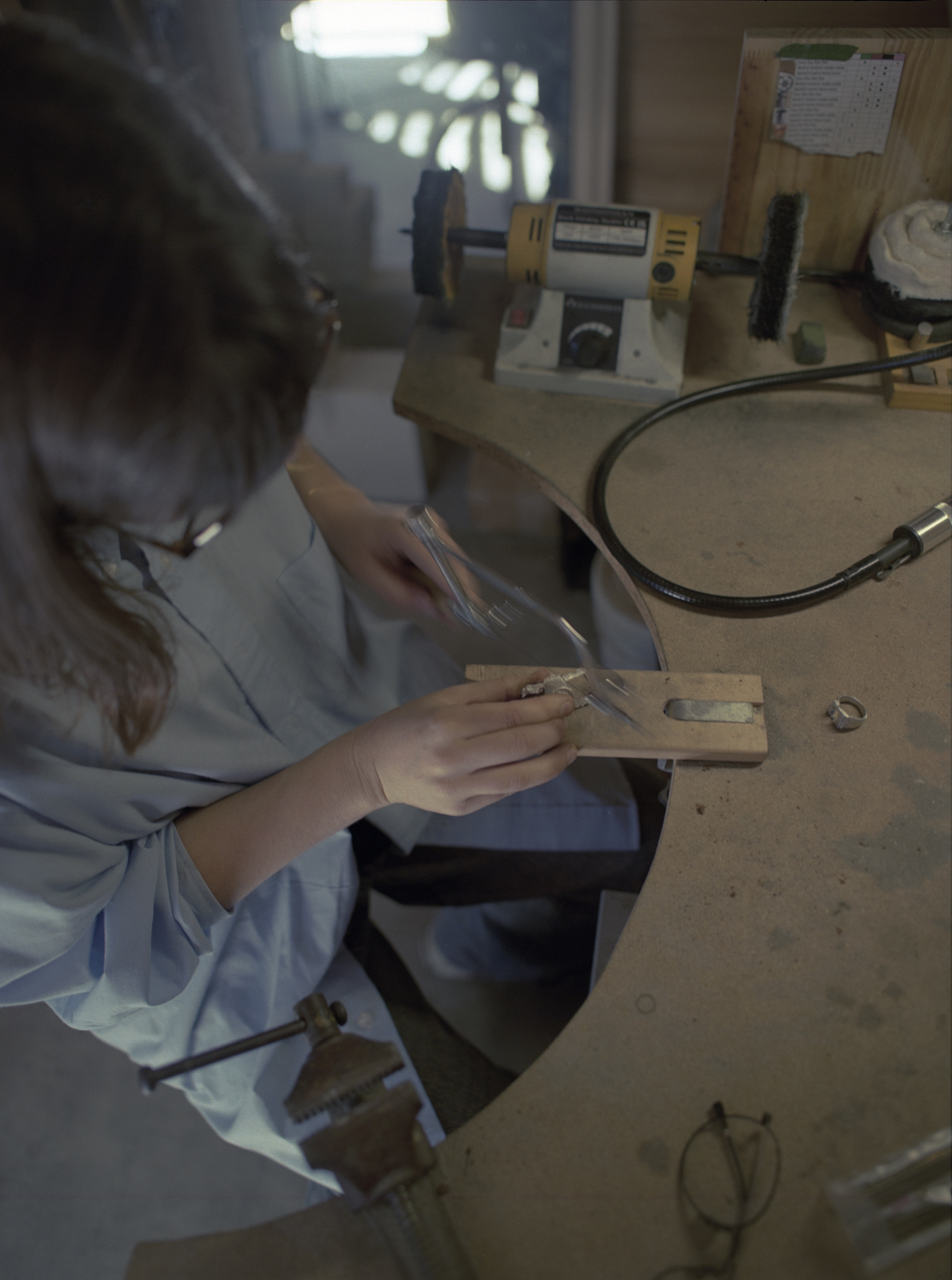 Once the piece has been cast and removed from the clay mold, the excess is removed and recycled, and then the shaping begins. This step is quite long, but from my point of view it seems almost meditative. The piece is then adjusted to the desired size, and she applies a coating to the ring before finally polishing it.