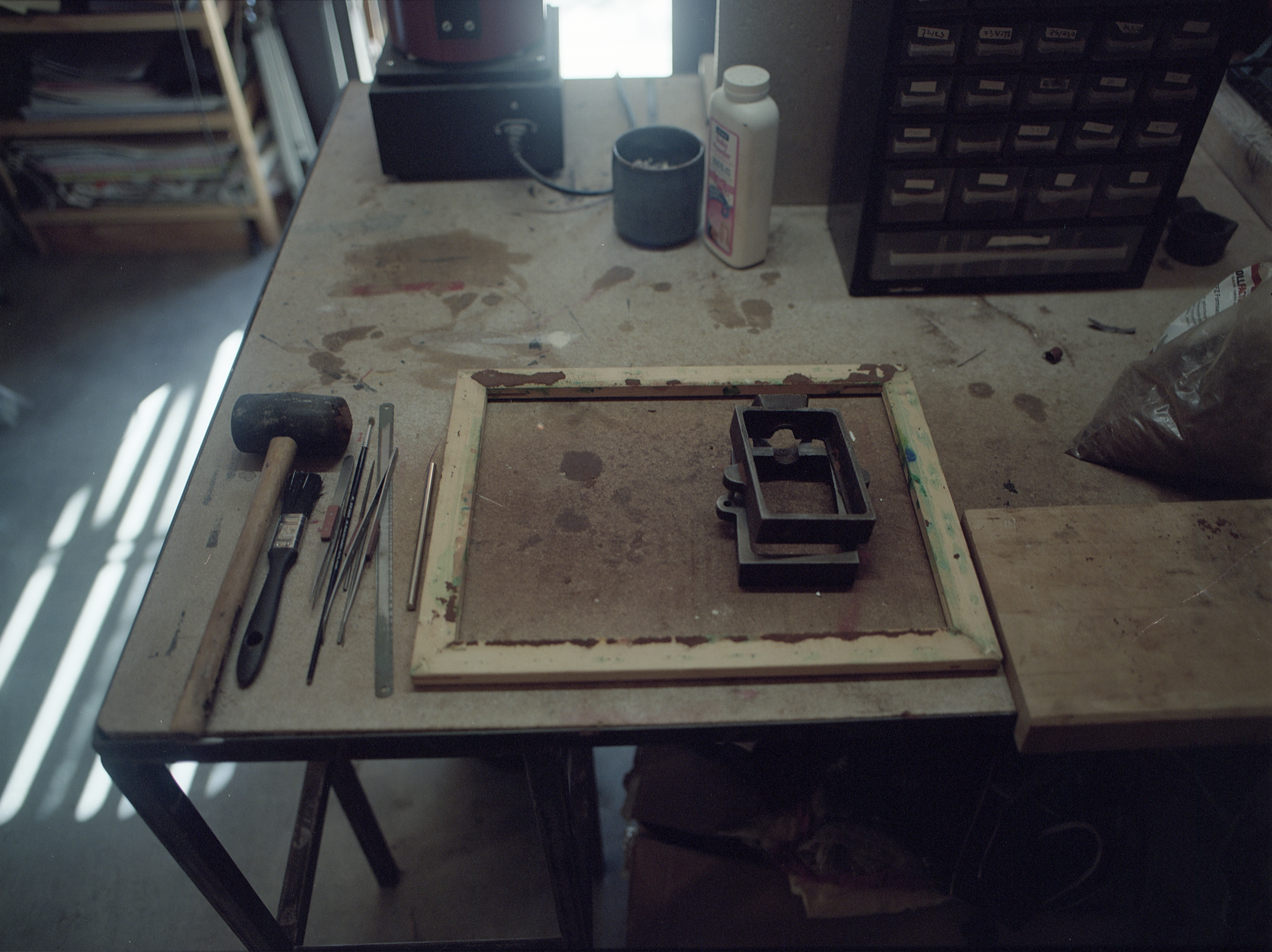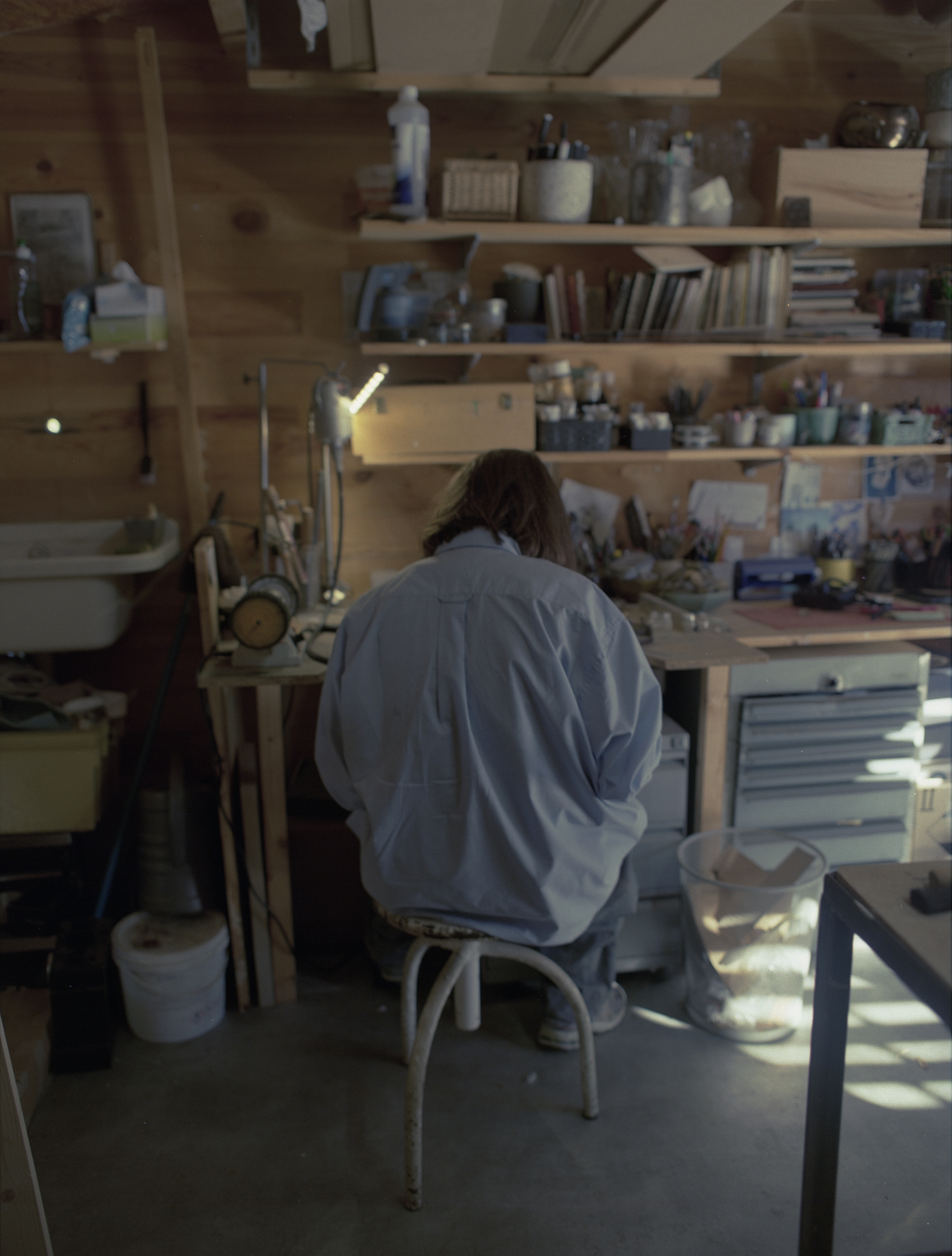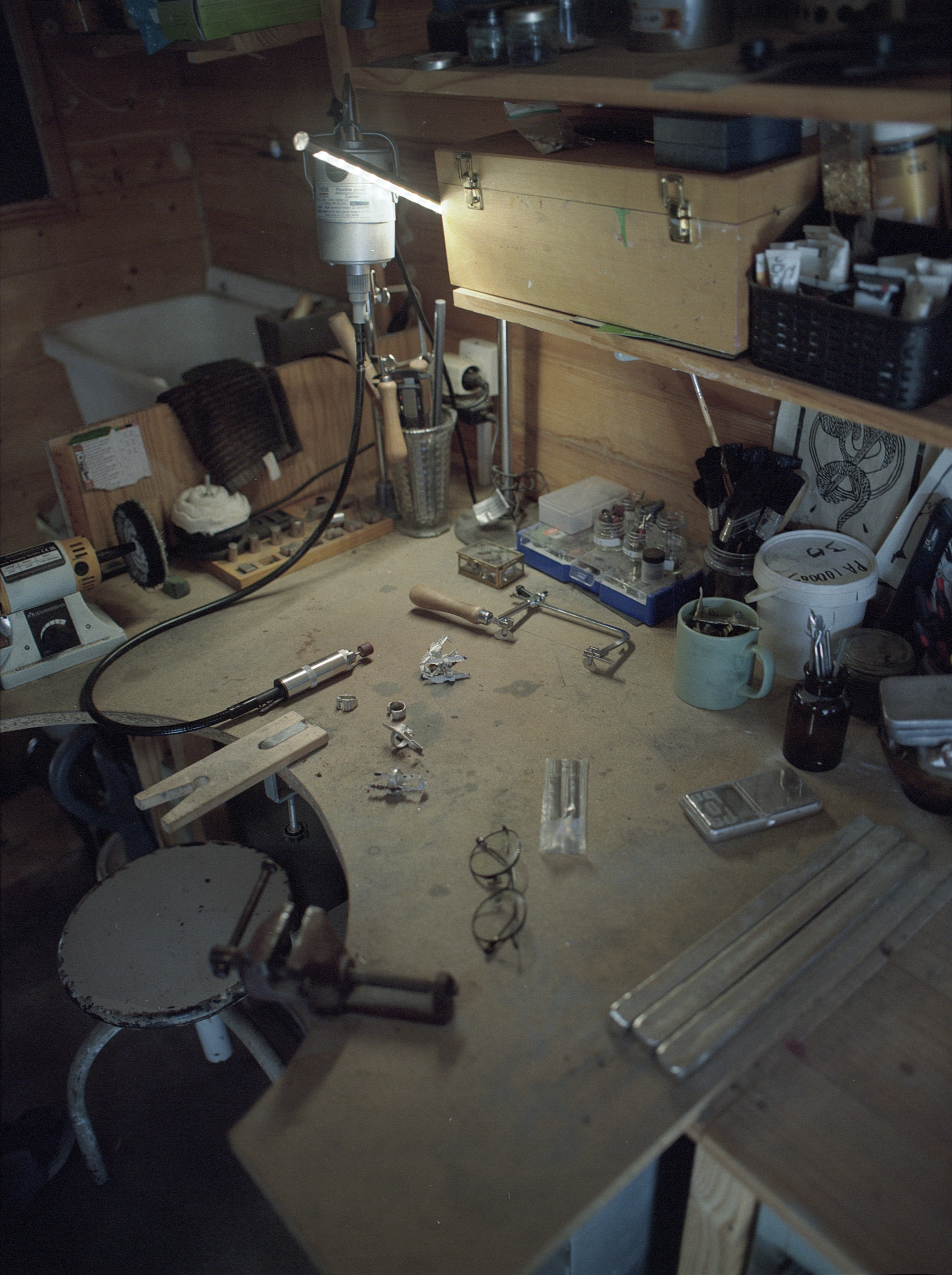 Quelques mois plus tard, je rencontre Justine Salvado, la fondatrice de la marque de bijoux archive.s dans son atelier près de Narbonne. Un petit espace lumineux, suffisant pour accueillir sa pratique artistique et sa création de bijoux mais aussi sa sœur peintre. C’est un cabanon rempli d’outils dont elles ont besoin mais aussi pour expérimenter diverses techniques.